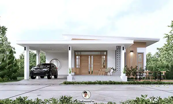 บ้านปั้นหยาชั้นเดียว แบบบ้านสีขาวสบายตา ฟังก์ชันสะดวกสบาย 2 ห้องนอน 97 ตร.ม. แบบบ้านชั้นเดียว S-164