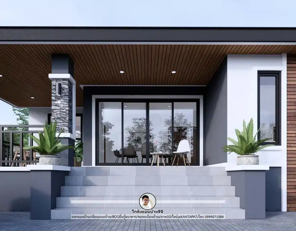 แบบบ้านหลังนี้หลังนี้เป็นหลังคาทรงปั้นหยา ชนิดหลังคาใช้เป็นแบบหลังคาซีแพกโมเนีย ซึ่งได้รับความนิยมกับหลังคาทรงนี้ มีความแข็งแรงทนทาน ไม่รั่วซึม หลังคาสีเทาปีกนกนางนวลลอนหรูหรา ดูโดดเด่นทันสมัย เข้ากันกับตัวบ้านสีขาวและสีเทาอย่างลงตัว ผสานการตกแต่งด้วยหินกาบตกแต่งผนัง และไม้ฝาตกแต่งที่เข้ากับธรรมชาติอย่างลงตัว สวยงามโดดเด่นเป็นธรรมชาติ และยังแข็งแรงทนทานด้วยวัสดุสมัยใหม่ ตัวบ้านเป็นบ้านชั้นเดียวยกพื้นสูง มีพื้นที่พักผ่อนระเบียงหน้าบ้าน นั่งรับลมชมวิว ช่างเป็นบ้านที่ดูสงบสุข เรียบง่ายเหมาะกับการพักผ่อนที่แท้จริง ภายในบ้านมีห้องโถงเชื่อมกับห้องของตัวบ้าน ห้องครัว ห้องนอน ห้องน้ำ ถือเป็นอีกหนึ่งตัวอย่าง แบบบ้านสวย ๆ ที่นำมาให้ได้รับชมกันอีกหลังเลย