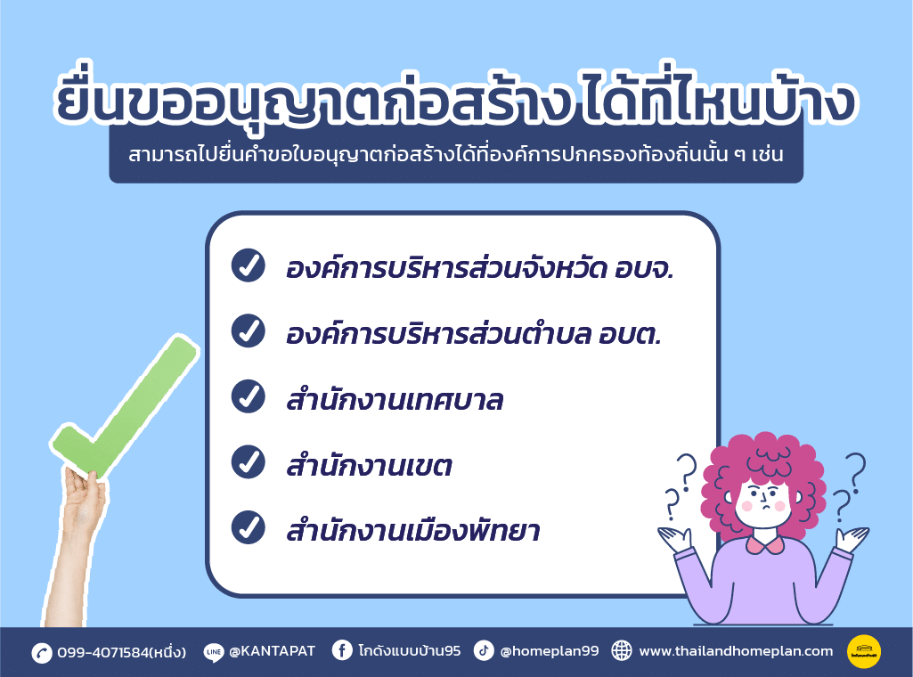 เมื่อเรามีแบบบ้านเรียบร้อยแล้วต้องการขออนุญาตก่อสร้าง สามารถไปยื่นคำขอใบอนุญาตก่อสร้างได้ที่องค์การปกครองท้องถิ่นนั้น ๆ เช่น
