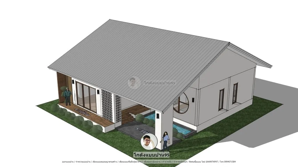 - ประกอบด้วย: บ้าน 105 ตร.ม./ระเบียง 24 ตร.ม./ซักล้าง 10 ตร.ม./บ่อปลา 12 ตร.ม.