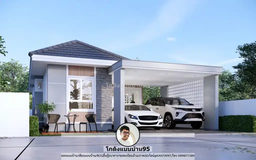 แบบบ้านชั้นเดียว แบบบ้านปั้นหยา พร้อมที่จอดรถที่สามารถจอดได้ถึง 2 คัน บล็อกช่องลมช่วยกรองแสง ให้ความสว่าง ไม่รู้สึกอึดอัด ทำให้รู้สึกโปร่งโล่ง