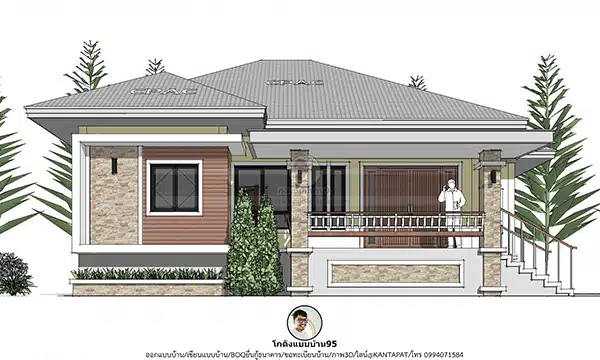 ออกแบบบ้านสวย ๆ ทรงปั้นหยา บ้านชั้นเดียว 3 ห้องนอน 94 ตร.ม. รับเขียนแบบบ้าน P-2337